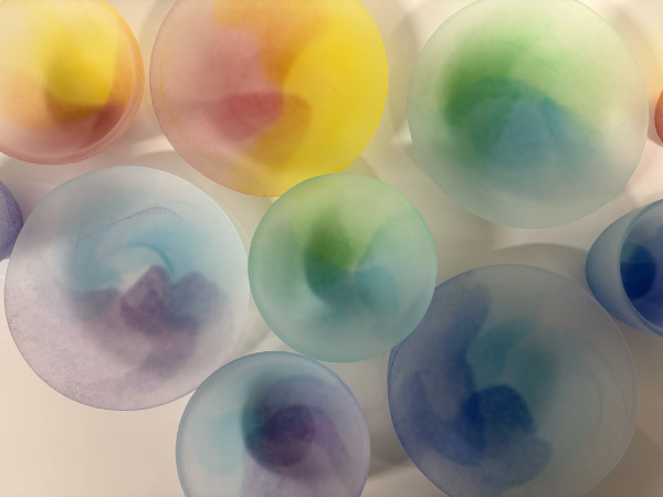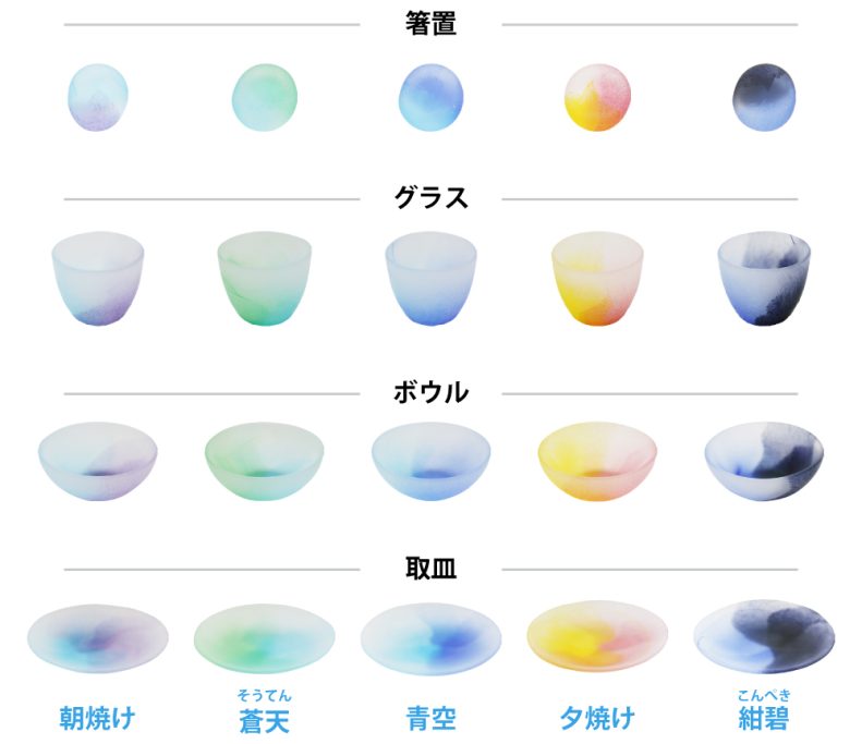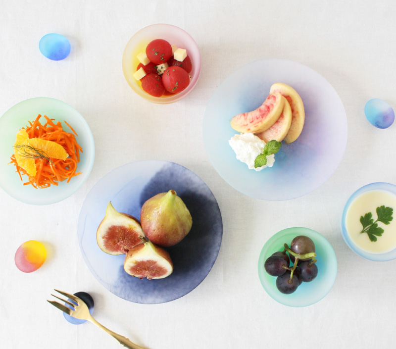 移ろいゆく空の色彩を、フロスト加工を施した江戸硝子で繊細に表現したテーブルウェア。