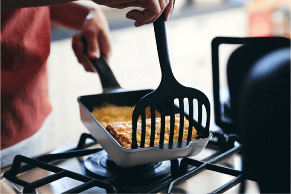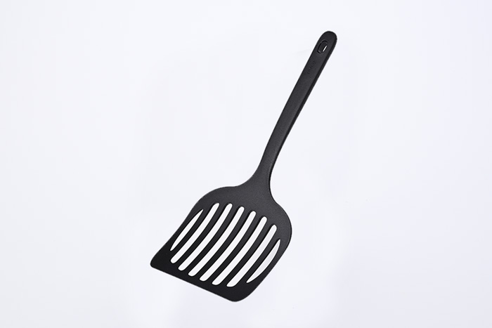 卵焼き器の形状に合わせた専用ターナーが付属。ひっくり返す際も崩れにくく、きれいなだし巻き卵が簡単に作れます。耐熱温度210℃のナイロン製(ガラス繊維入り)で安心して使えます。